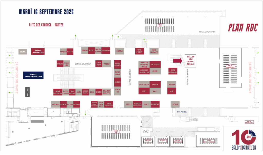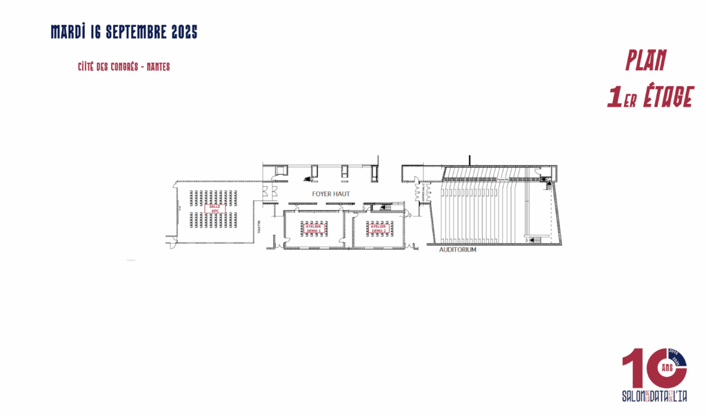 Le Salon en 2025 Le programme du Salon de la Data et de l'IA est enfin là ! Découvrez dès maintenant la programmation complète de cette 10 ème édition. Préparez-vous à une journée riche en conférences inspirantes, ateliers pratiques et échanges passionnants avec les experts du secteur. Cliquez ici Accédez à la version imprimable du planning sur ce lien N'oubliez pas de consulter les plans du salon : Attention, cette année, les salles de conférences seront au Rez de Chaussée, ainsi qu'au 1er étage.